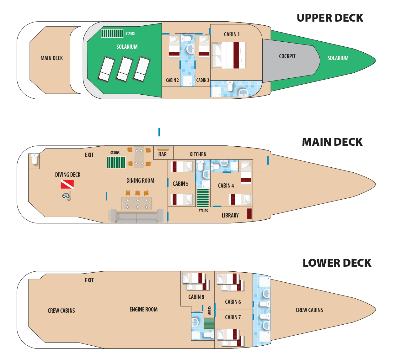 - 3 bunk bed cabins (Lower Deck)